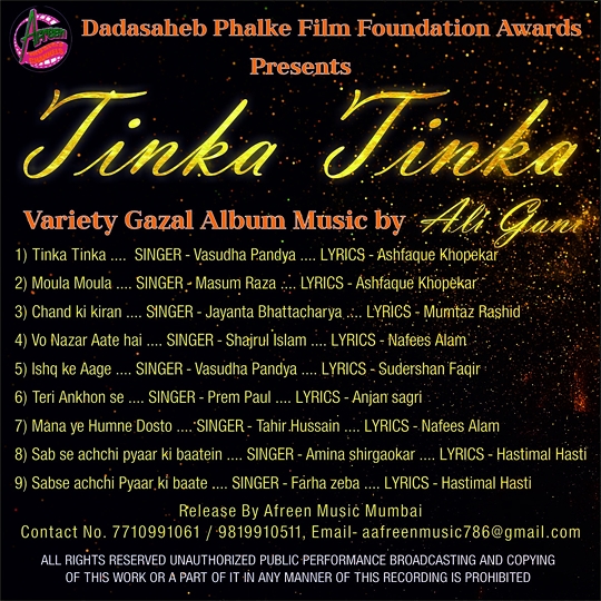 दस नये गायक गायिका बड़ोदरा गुजरात से वसुधा पंड्या, वेस्ट बंगाल से मासुम रज़ा, पुना महाराष्ट्र से मंजु सिन्हा, दिपा सराइ , संभल,उ॰प॰ से साजरुल इस्लाम और मोराबाद उ॰प॰ के ताहीर खान,मध्यप्रदेश से तरुणा शुक्ला,कलकत्ता से जयंता भट्टाचार्या , हैदराबाद से फरहा ज़ेबा, पंजाब से प्रेम पॉल तथा उत्तन मुम्बई से अमीना शिरगांवकर इन १० नये प्रतिभाशाली गायको को ग़ज़ल अल्बम तिनका तिनका में प्लेबॅक गायन का मौका दिया गया। तिनका तिनका ग़जल अल्बम की ग़ज़ले जानेमाने मशहूर शायर सुदर्शन फाकिर,नफिस आलम, अंजान सागरी, आशफाक खोपेकर, मुमताज़ राशिद और हस्तीमल हस्ती की लिखी हुई है तथा पंकज उदास फेम संगीतकार अलीगनी के संगीत से इसे संवारा है। ग़ज़लों की रिकाॅर्डीग मुम्बई के AB Studio मे रिकॉर्डीस्ट अरविंद जी ने तथा सिंगरो होम टाउन नोयेडा शहर के Future of Music मे साउंड रिकिर्डीस बिस्वजीत और Lets Mix स्टुडीओ , हैदराबाद के Laxvil dubbing and recording studio तथा पंजाब के स्टुडीओ में रिकॉर्ड कराया गया और सारी ग़ज़लो की मिक्सींग प्रख्यात साउंड इंजीनियर बीजु नायर ने मुम्बई में की है।
