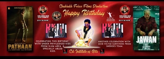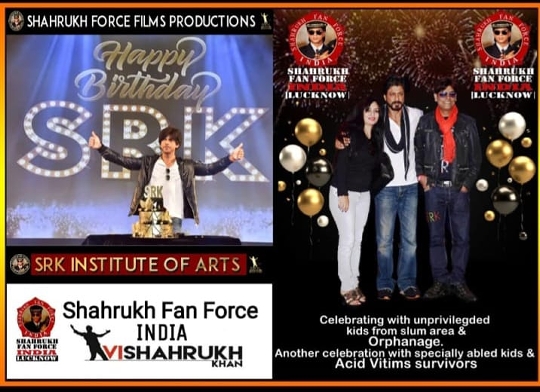 लखनऊ में शाहरुख फैन फोर्स के प्रेसिडेंट विशाल सिंह उर्फ विशाहरुख ने आज शाहरुख खान के जन्मदिन के अवसर पर सभी फैंस की तरफ से अनोखे तरीके से जन्मदिन मनाया । सबसे पहले सहारा स्टेट स्थित जयति भारतम् दिव्यांगजन संस्था में जाकर विशाहरुख ने अपनी पत्नी रुचि खान बेटी सिमरन और बेटे आर्यन के साथ केक काटकर तकरीबन 30 दिव्यांगजनों के बीच खाने-पीने की सामग्री वितरित कर जन्मदिन मनाया। उसके बाद मूकबधिर बच्चों के स्कूल जाकर शिखा सिंह के साथ केक सभी बच्चों से कटवाकर मनाया l सब बच्चों को गिफ्ट देकर शाहरुख खान का जन्मदिवस बेहद खास तरह से मनाया और सभी दिव्यांगजनो और मूकबधिर बच्चों और स्टाफ ने शाहरुख खान की लंबी आयु के लिए प्रार्थना की ।